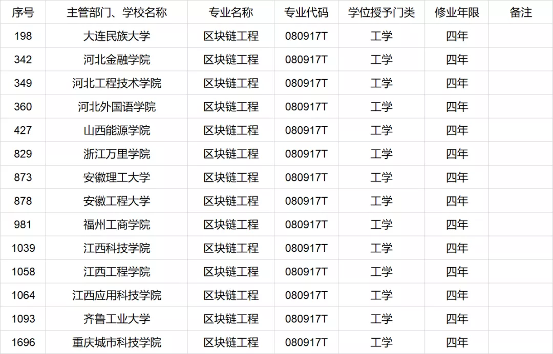 隨著區塊鏈在行業發展初期迎來短期爆發式的增長,必將面臨行業相關人才儲備不足,從業單位用人難的問題。為此,2021年2月10日,中華人民共和國教育部《關于公布2020年度普通高等學校本科專業備案和審批結果的通知》(簡稱《通知》)中公布,我國共有14家高等院校,申請開設了“區塊鏈工程”本科專業課程,持續為行業輸送后續力量,區塊鏈人才短缺問題,將在幾年后得到有效緩解,并持續為行業輸送后續力量。本次公布的14家高校分別為大連民族大學、河北金融學院、河北工程技術學院、河北外國語學院、山西能源學院、浙江萬里學院、安徽理工大學、安徽工程大學、福州工商學院、江西科技學院、江西工程學院、江西應用科技學院、齊魯工業大學、重慶城市科技學院。